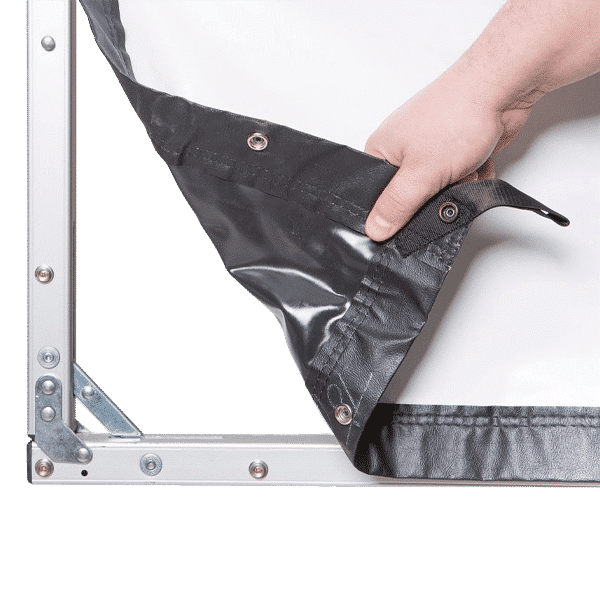 Les toiles de projection sont dotées d’un ourlet noir de 5 cm de large sur tout le pourtour. Elles sont fixées au cadre à l’aide de boutons-pression et sont toujours tendues de manière plane.